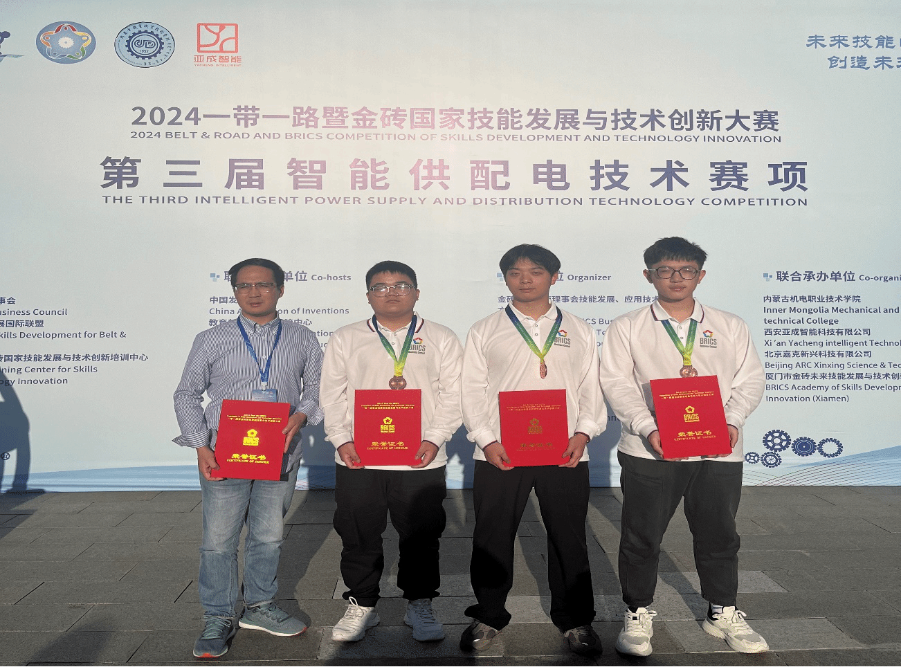 本网讯 9月19日-22日,由金砖国家工商理事会、一带一路暨金砖国家技能发展国际联盟、中国科协等单位共同主办的2024年“一带一路”暨金砖国家技能发展与技术创新大赛第三届智能供配电赛项在内蒙古机电职业技术学院成功举办,本次大赛有来自28个省、直辖市共110余支团队参加。经过初赛、决赛等竞赛环节,由电气技术学院侯超群等老师指导的信子恒、赵宇、谢钦锋团队在4天的激烈的竞争中脱颖而出,荣获全国总决赛三等奖。