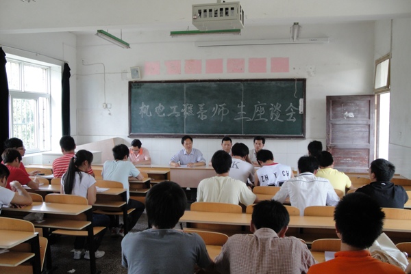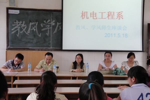 为了加强我系师生间的交流,增进师生间的感情,同时也为了了解我系各专业学生目前的学习状态和思想动态,我系于2011年5月18日下午14:30分在1栋教学楼101、102、103、104、105教室针对我系学生的学习、生活、实习、学风建设、就业等方面的问题召开了机电系师生交流座谈会。座谈会上,同学们敞开心扉,畅所欲言,各抒己见,结合实际情况提出了一些关于学习、实习、考证、教学和就业等方面的建议。针对大家提出的问题和建议,系里老师们一一为同学们做出了解释和提出改良的意见。