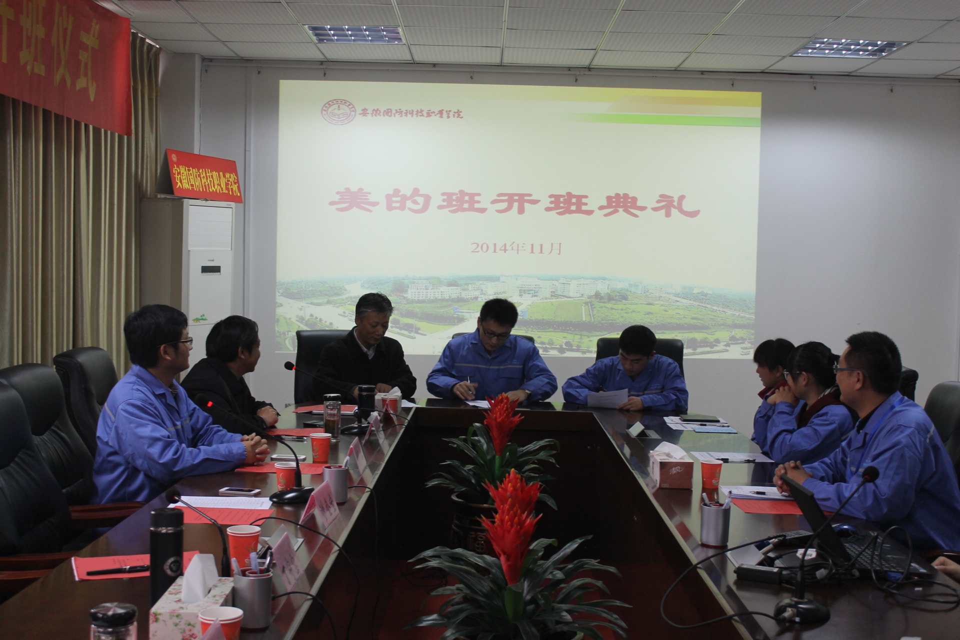 为深化教育教学改革,改进人才培养模式,促进校企合作、校企融合共同开展人才培养,增强人才培养工作的针对性和实效性,提高毕业生的就业竞争力和就业质量,11月23日上午9:00,机电工程系与合肥美的洗衣机有限公司合作开展订单式人才培养的培养--“美的班”开班典礼,在学院行政楼4楼会议室举行。学院党委委员、副院长丁守宝,教务处处长王志宏,机电工程系主任陈小林、党总支书记陈兆同、副主任李翔、团总支书记张红军、合肥美的洗衣机有限公司人力资源部经理沙金宝、招聘经理刘山及“美的班”校企双方班主任和全体“美的班”学生参加了开班典礼,开班典礼由系党总支书记陈兆同主持。