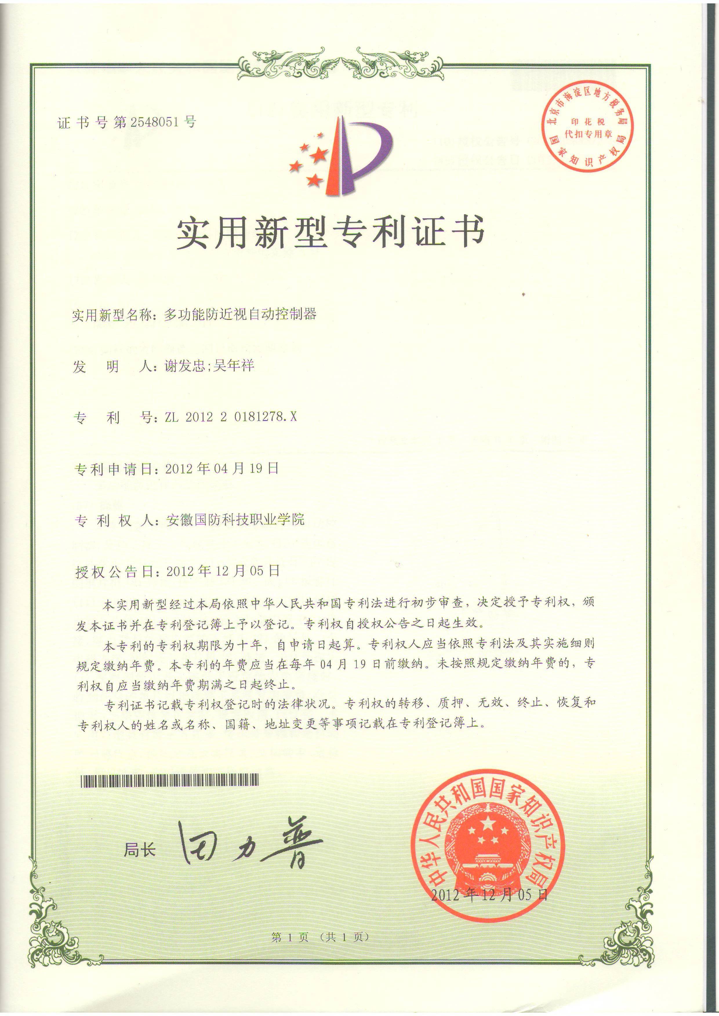 我系副教授、高级工程师谢发忠老师和助理实验师吴年祥老师,于2012年12月成功申报“多功能防近视自动控制器”实用新型专利一项,编号ZL 2012 2 0181278.X,在此向以上教师表示祝贺。
