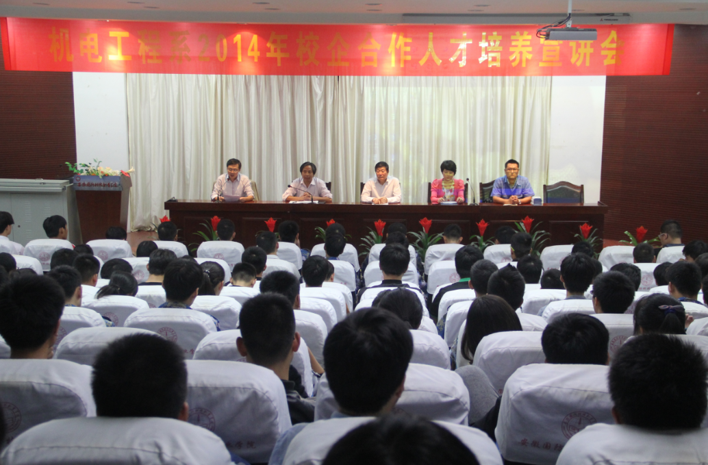 9月19日晚上,机电工程系2014校企合作人才培养宣讲会在图书馆报告厅举行,宣讲会由机电工程系副主任李翔同志主持,机电工程系党总支书记陈兆同出席了宣讲会,并就校企合作开展人才培养的目的和意义、校企合作开展人才培养的优势和长处以及参加冠名班报名程序和办法等进行了动员。接着,安徽国晶微电子有限公司顾问曾候银、总经理办公室主任张琴琴以及美的集团(合肥)美的洗衣机有限公司招聘主管陶心愿等二家合作企业代表,分别就本公司与我系合作设立的企业冠名班相关情况作了宣传介绍,并详细解答了学生提出的问题。