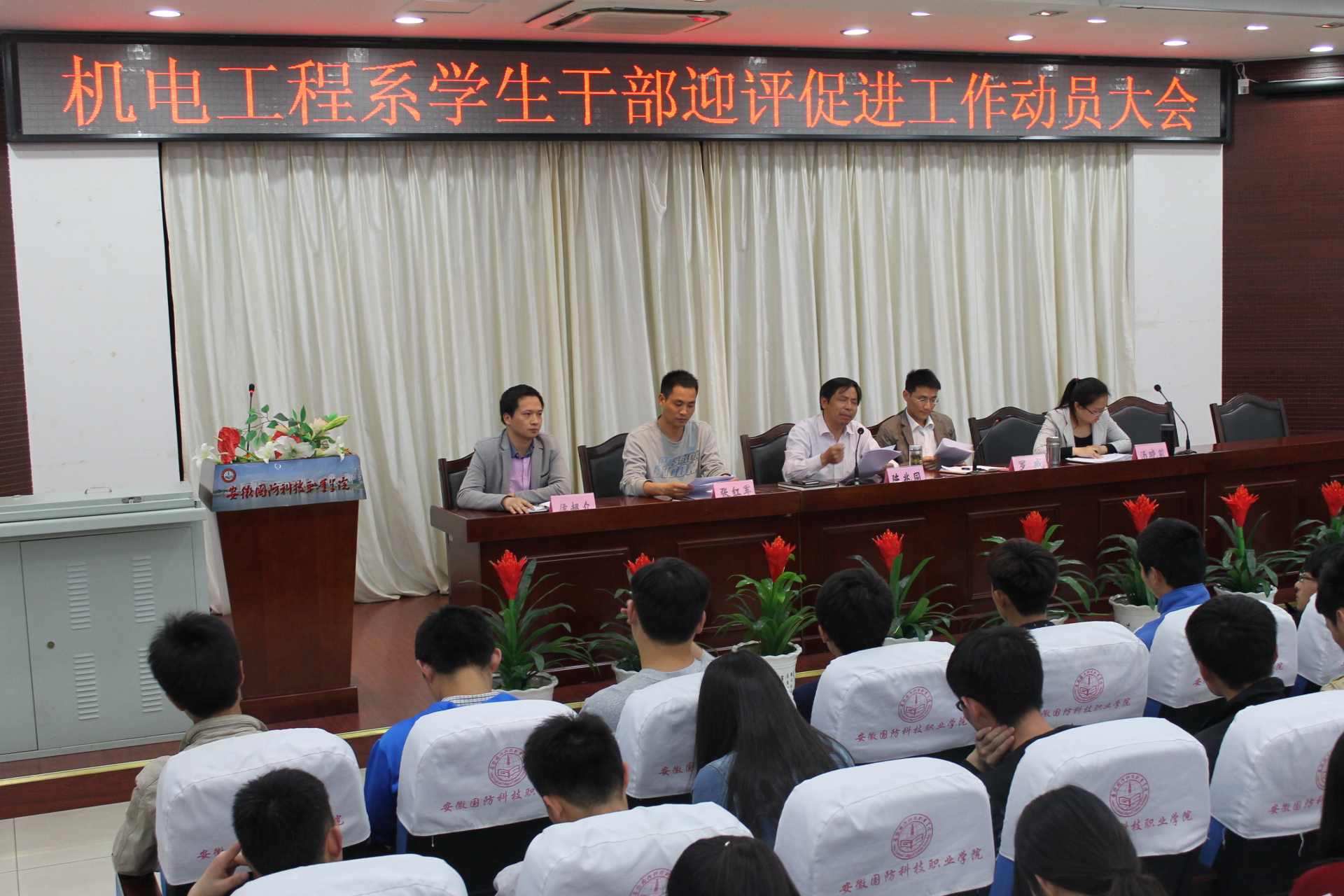 为全面做好学院人才培养工作个性评估期间的学生日常管理工作,教育引导学生以饱满的热情、积极的心态迎接评估,以实际行动为学院评估添彩加分,充分展示我系大学生的精神面貌,机电工程系于4月24日下午在图书馆报告厅召开了全系学生干部迎评促建动员大会,系党总支书记陈兆同、副书记罗威、团总支书记张红军及系辅导员参加了会议,会议有机电工程系党总支副书记罗威主持。