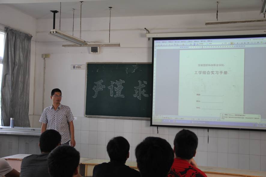 会上机电工程系副主任李翔老师首先解读“工学结合实习方案,重点阐述了此次安排全体同学到省级船舶人才培养基地建设项目合作企业------蚌埠神舟机械有限公司进行为期四个月的生产性轮岗实习工作内容和注意事项;其次机电工程系书记叶启衡老师布置同学们离校前的相关工作;然后船舶电工电子专业负责人侯国栋老师解读“工学结合实习手册”。最后机电工程系主任陈小林老师做重要讲话。