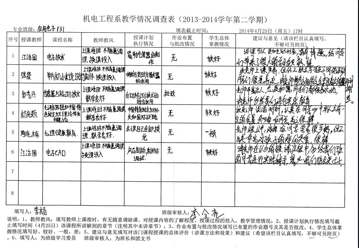 为配合2013-2014学年第二学期期中教学检查工作开展,切实摸清系属各班级教师教学履职情况和学生掌握情况,根据机电工程系教风、学风建设年实施方案和系督导学期工作计划安排,机电工程系于2014年4月23日至25日成功组织开展了2013-2014学年第二学期期中教学情况调查专项活动,各班学习委员在征求班级全体同学意见的基础上,会同班长、团支书认真填写了教学情况调查表,调查表格填写详实具体,并全部按时收回。