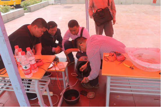 早上,志愿者们在社区工作人员的帮助下搬运工具,摆放桌椅,连接电源,不久便吸引了居民们纷纷带着电饭煲、小风扇、电磁炉等废旧家用电器前来维修电气技术学院的师生们仔细检查并询问家电的损坏情况,一丝不苟地诊断每一件电器所存在的问题专心致志地修理每一部电器,利用自身所学知识竭尽所能为前来的社区居民解决电器故障,对家电进行“手术”抢救。