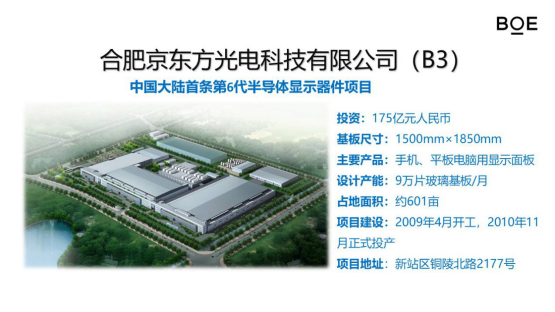 合肥目前拥有一条总投资175亿元第6代(B3)、一条总投资335亿元8.5代(B5)和一条总投资458亿元第10.5代TFT-LCD线(B9),产品覆盖全尺寸液晶产品,适用于电视机、桌面电脑、笔记本电脑、平板电脑、手机等产品的显示器件。