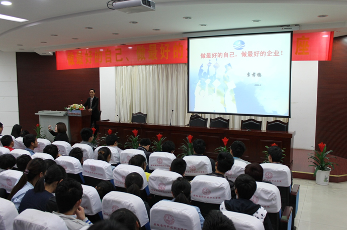 李总经理从“自己”和“企业”两个角度对个体的职业发展进行了分析,并从有利因素和不利因素两方面加以剖析,使学生对职业能力的提升和企业对人才的需求有了一个清醒的认识,也对当前的就业形势有了科学的判断。整个讲座在融洽的交流氛围中进行,现场气氛十分活跃,风趣幽默的语言不时引起在座同学的阵阵笑声;而深入浅出的讲解又让同学们在欢乐之余高效地学到了生活和就业的宝贵经验。