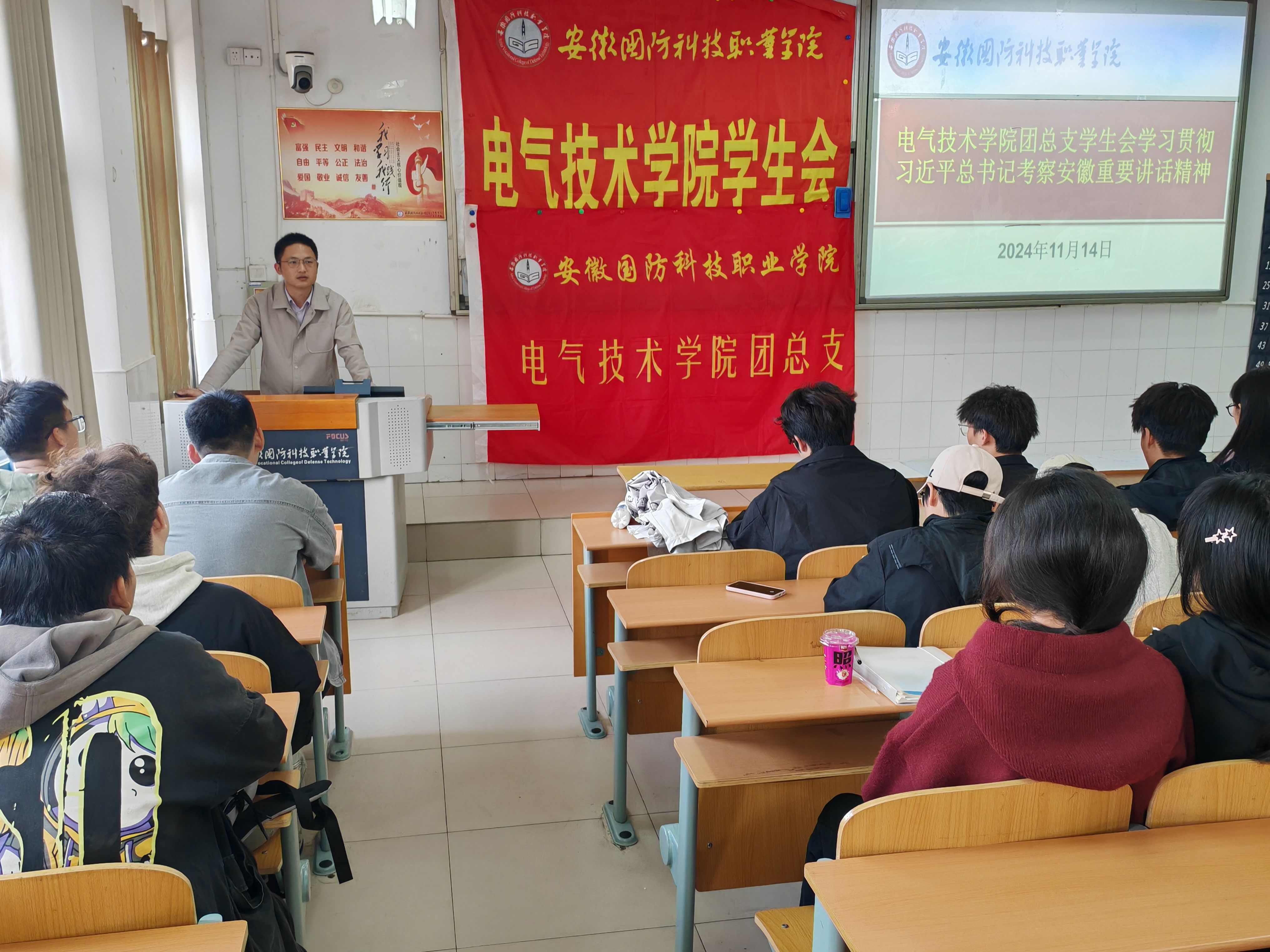 为深入贯彻落实习近平总书记考察安徽重要讲话精神,深刻领会精神实质,坚决把思想和行动统一到习近平总书记重要讲话精神上来。11月14日晚,电气技术学院团总支学生会在2教105组织开展了学习会议。学院团总支书记陈俊及团总支学生会全体成员参与会议,会议由陈俊主持。