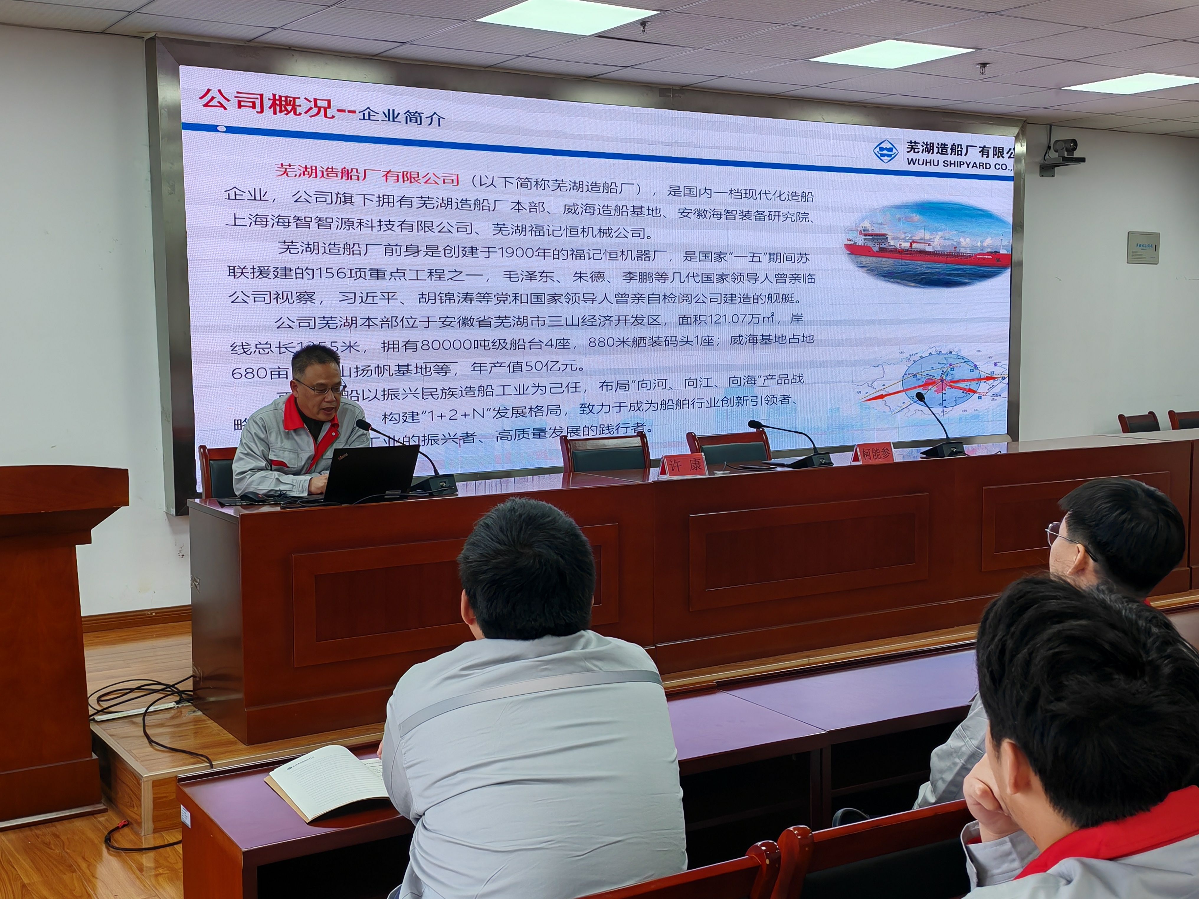 宣讲会上,柯能参经理围绕芜湖造船厂的公司概况展开详细介绍。他深入浅出地阐述了企业的发展历程、业务范围、行业地位以及未来规划,使同学们对芜湖造船厂在船舶制造领域的深厚底蕴和广阔前景有了清晰直观的认识,激发了同学们对投身船舶行业的兴趣与热情。