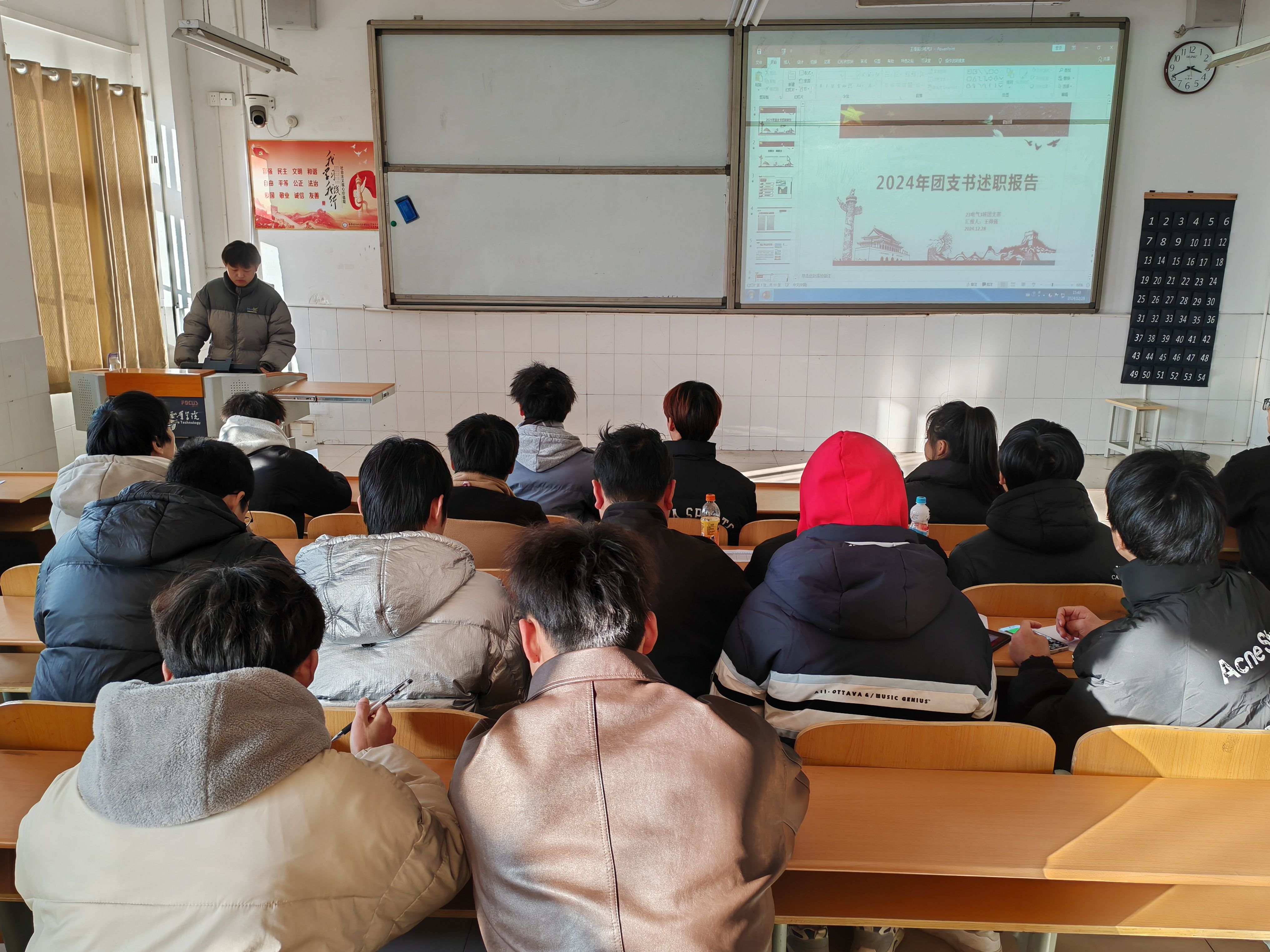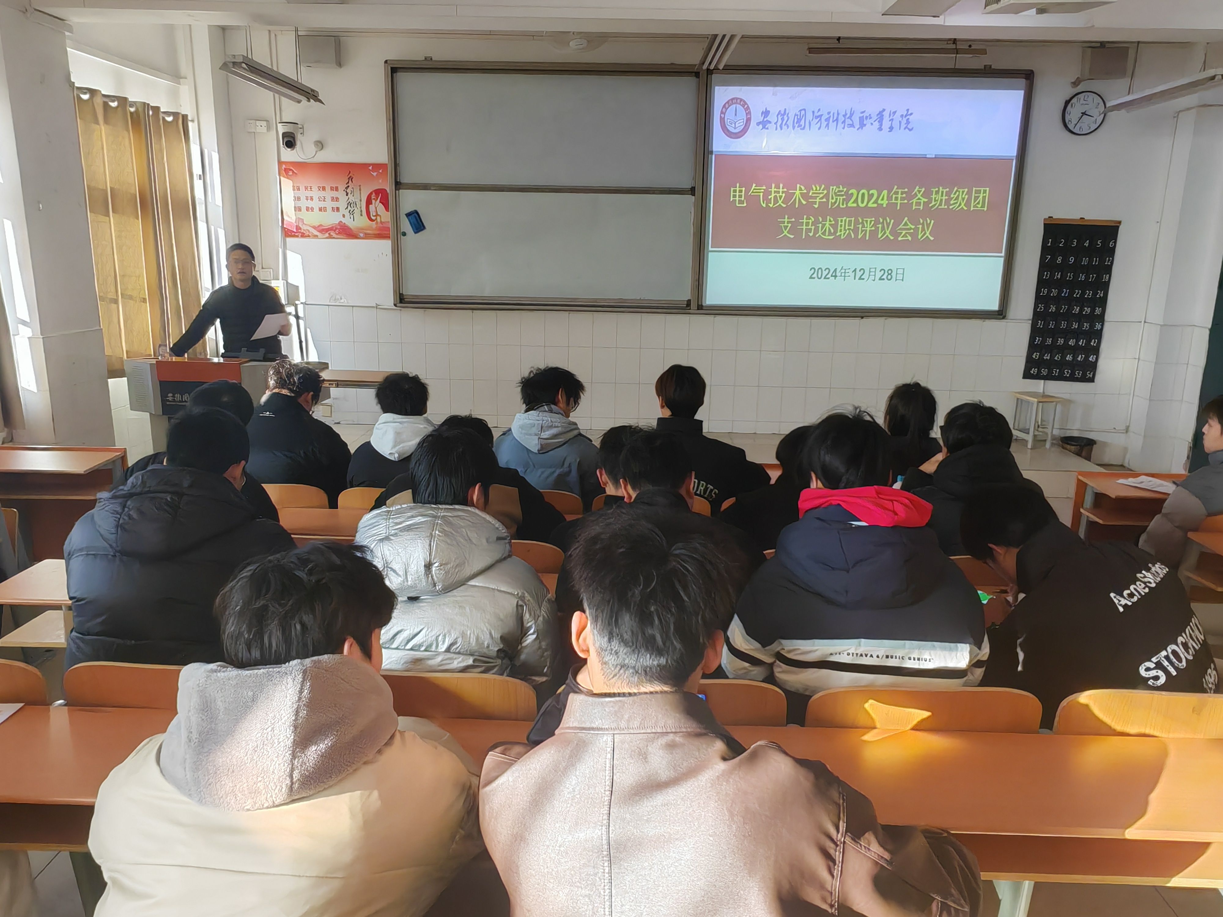 为深入学习宣传贯彻党的二十大和二十届三中全会精神,进一步深入贯彻习近平总书记关于青年工作的重要思想,持续全面深化共青团改革和全面从严治团,提高基层团组织的引领力、组织力、服务力和大局贡献度。12月28日下午,电气技术学院组织各班级团支书和团员代表在2教105教室召开2024年团支书述职评议会议。此次会议由学院团总支书记陈俊主持。