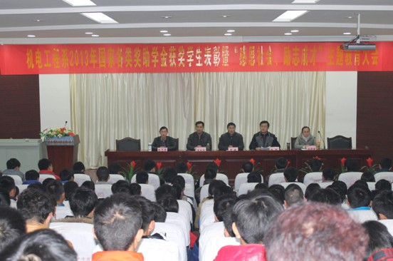 2013年12月4日晚19:30,机电工程系在图书馆报告厅隆重召开2013年国家各类奖助学金学生表彰暨“感恩社会、励志成才”主题教育大会。机电工程系党总支副书记罗威、院学生资助中心科科长杨超、辅导员杨志清和汤晓莉参加大会,会议由机电工程系团总支书记张红军老师主持。