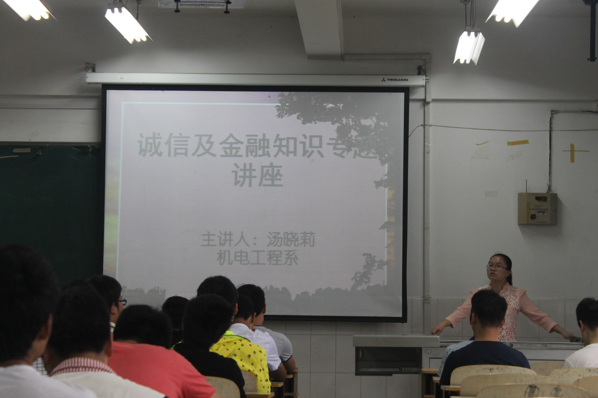 2015年5月29日下午17:10,机电工程系在二号教学楼208教室举办了诚信及金融有关知识专题讲座。机电工程系2014级全体受助学生参加了此次讲座,讲座由13级辅导员、系资助专职教师汤晓莉主讲。