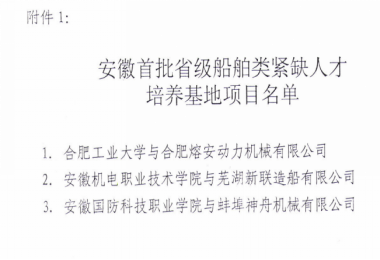 2012年学院被批准为安徽省船舶类紧缺人才培养基地,与蚌埠市神舟机械有限公司(蚌埠造船厂)共同承担基地建设任务,实现校企合作、订单培养。