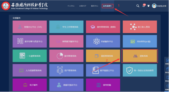 2、点击【业务直通车】按钮,然后点击【迎新系统】,进入迎新系统。