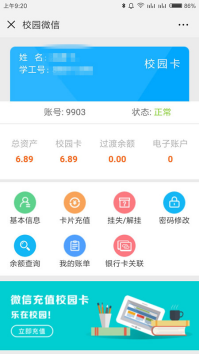 2、点击“应用服务”|“后勤服务”菜单,再点击“校园一卡通”图标(第一次使用要按提示绑定账号)。