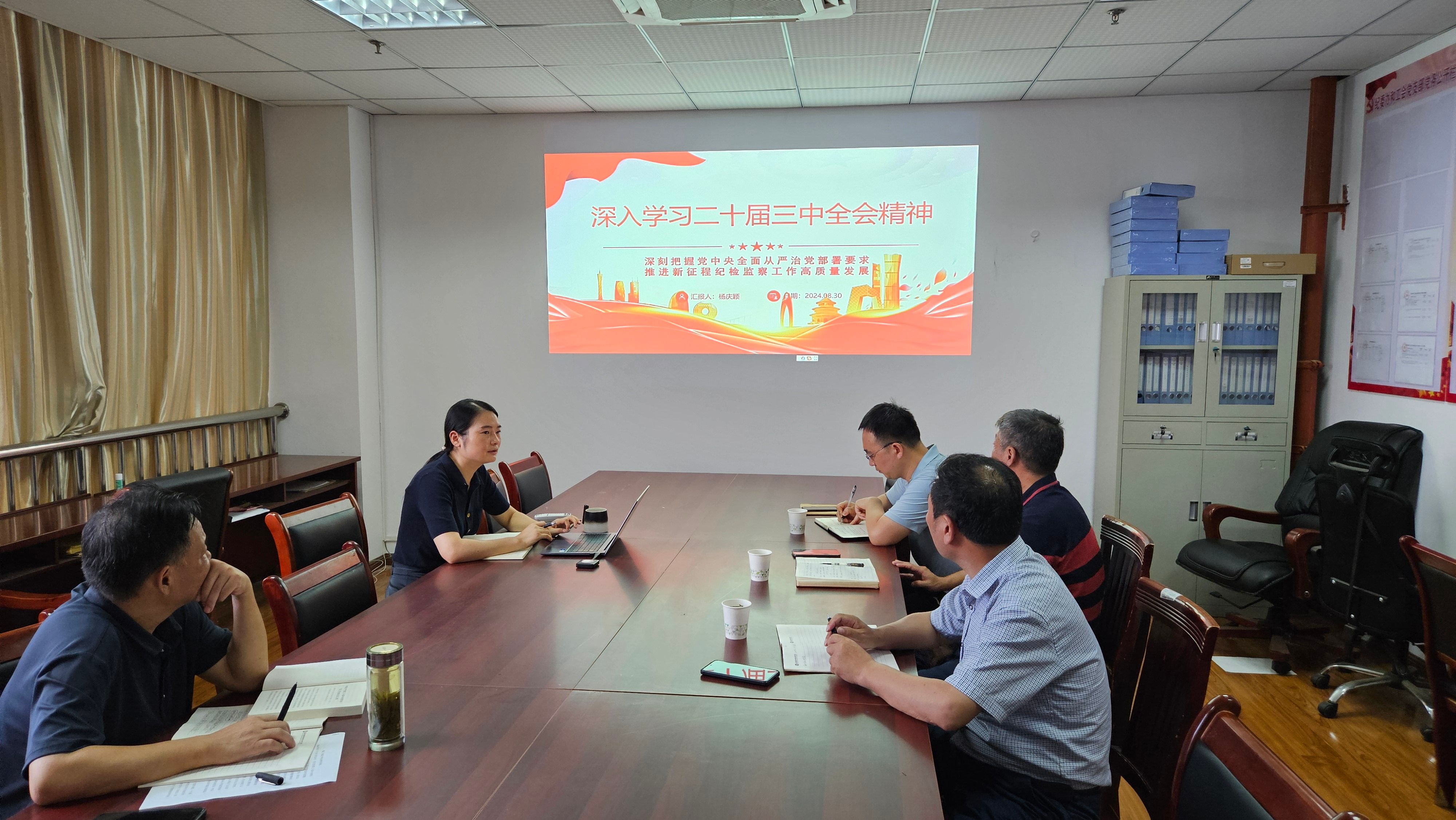 8月30日下午,学校纪委在秉心楼1204室召开了新学期纪委委员工作会议,专题学习党的二十届三中全会精神。会议由校党委委员、纪委书记丁守宝同志主持,校纪委委员及纪委办公室相关人员参加了会议。
