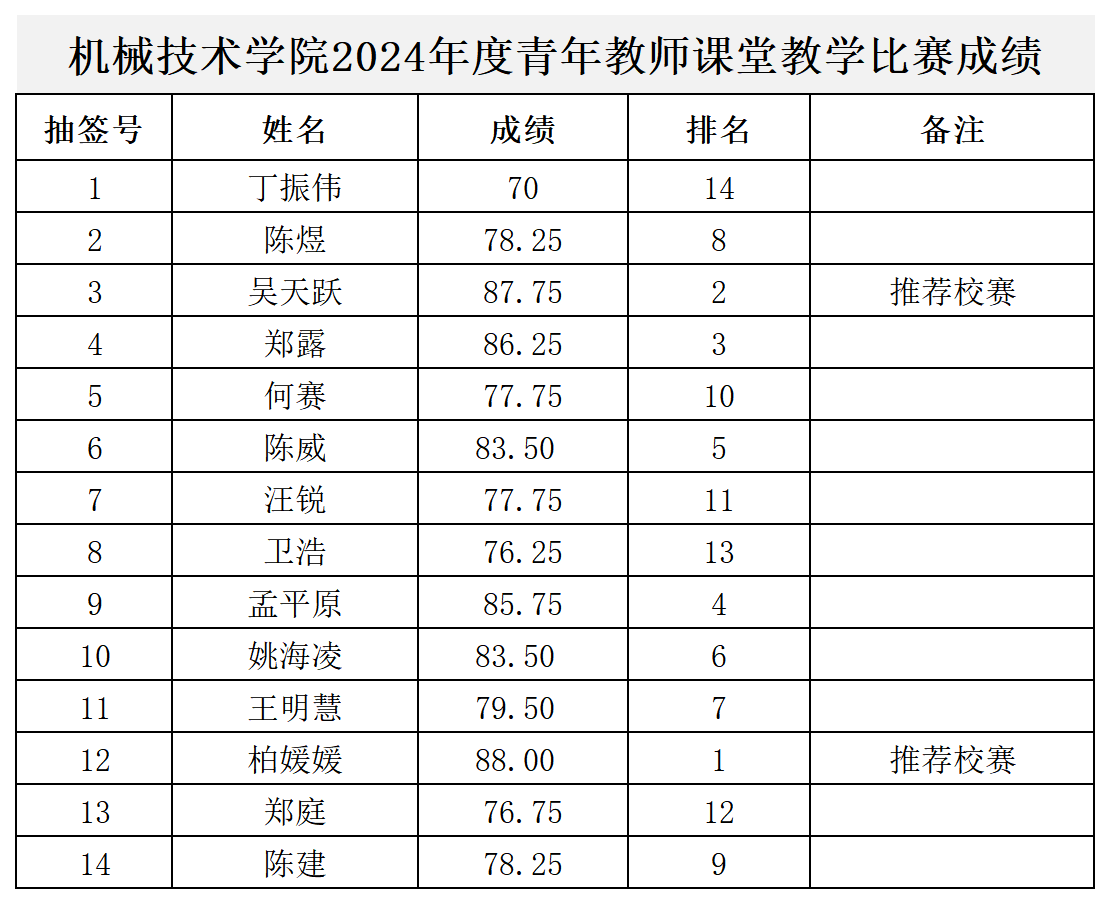 根据《机械技术学院关于开展2024年度青年教师课堂教学比赛活动的通知》(校机械学院〔2024〕28号)文件要求,现将机械技术学院2024年度青年教师课堂教学比赛成绩予以公示,公示期3天(11月7日至11月9日)。如有异议,请在公示期内向机械技术学院办公室知行楼117反映(联系电话:0564-3383783,电子邮箱:35311279@acdt.edu.cn),逾期不予受理。