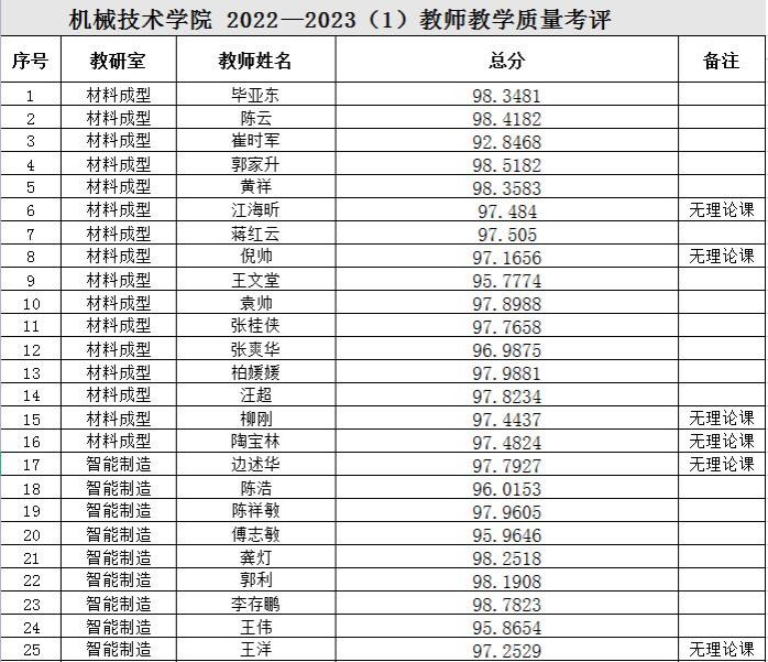 根据《beat365唯一官方网站教师教学质量考核评价办法(修订)》(校教[2022]9号),现将机械技术学院2022-2023学年第一学期教师教学质量考核成绩进行公示,公示期3天。如有异议,请致电0564-3383783。