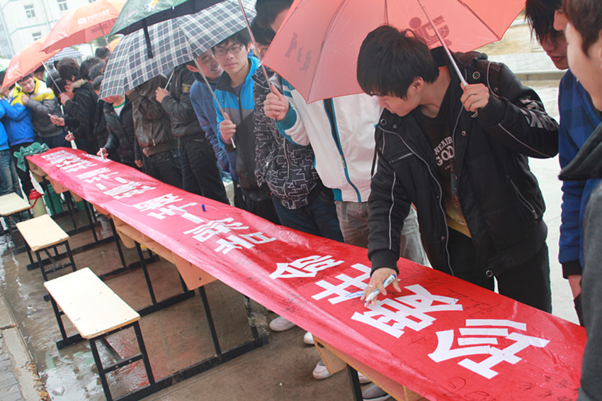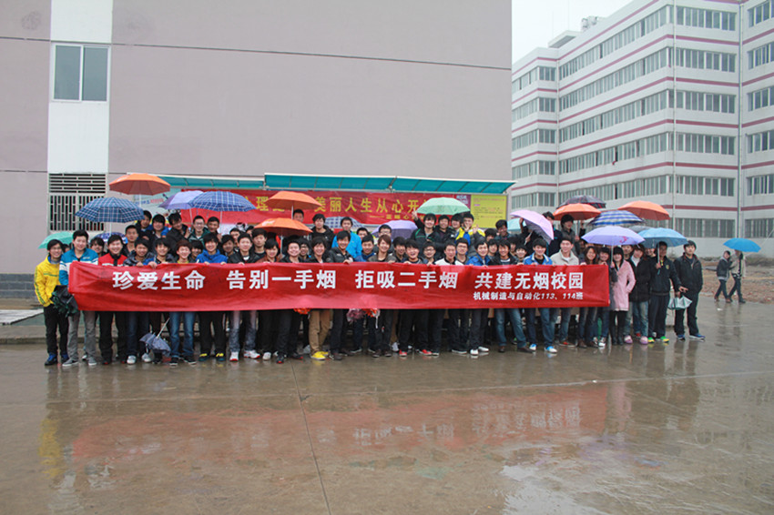 为贯彻落实学院《关于在消防重点部位实行禁烟的规定》精神,清新校园环境,告别吸烟,减少二手烟带来的危害,养成良好文明的生活习惯,3月15日上午,机械工程系机械制造与自动化113、114班举行了 “珍爱生命,告别一手烟,拒吸二手烟,共建无烟校园”倡议签名和图展活动。