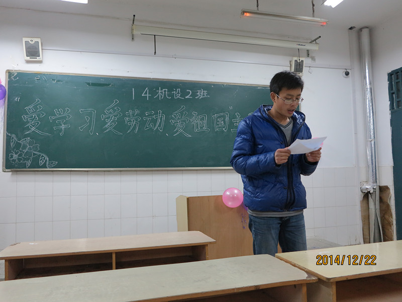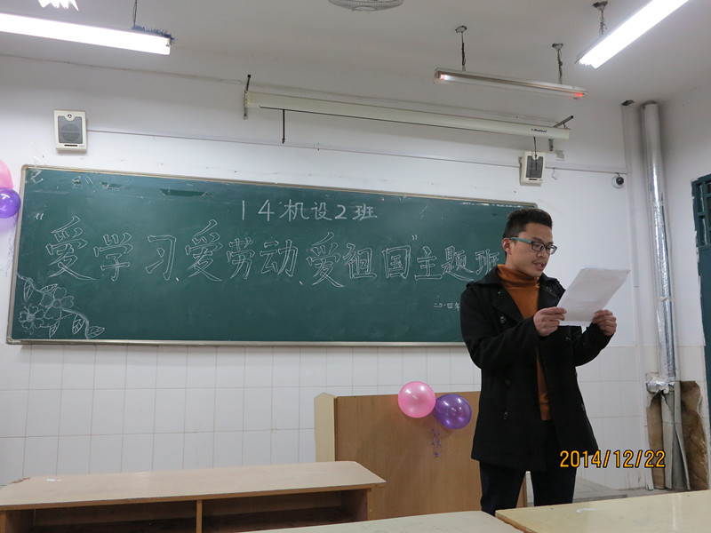 为切实响应习近平总书记对广大青少年提出的“爱学习,爱劳动,爱祖国”的号召,14机设2班于12月22日晚上在教203教室召开了“三爱”主题班会。出席此次活动的有班主任王世秀老师,系党总支书记吴方庭,和14机设2班全体同学。