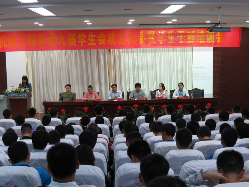 2013年10月9日下午,机械工程系在图书馆报告厅召开第九届学生会成立大会暨学生干部培训会。系党总支书记吴方庭、党总支副书记陈思、团总支书记孙策、11级辅导员杨静、12级辅导员张艳华、13级辅导员李从东及第九届学生会全体学生干部参加会议。
