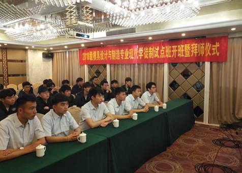 6月12日,机械技术学院模具设计与制造专业在白天鹅大酒店举行2018级现代学徒制试点班开班暨拜师仪式。机械技术学院党总支书记张宗江、机械技术学院副院长郭利、联德精密国防学院研发中心顾问夏世林、联德精密(中国)股份有限公司企划部经理康世杰、联德精密国防学院研发中心负责人赵恒、联德精密国防学院研发中心六位模具研发工程师、模具专业带头人张爽华、班主任张艳华及18级全体学徒制班学生参加了拜师仪式。仪式由副院长郭利主持。