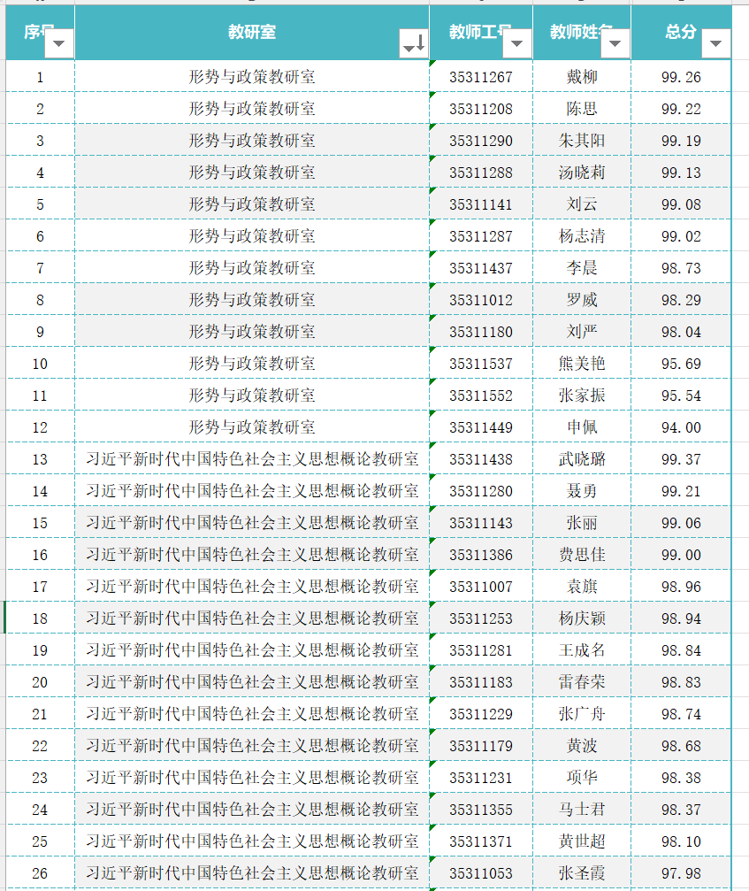 根据学校关于印发《beat365唯一官方网站教师教学质量考核评价办法(修订)》的通知(校教[2022]9号)文件精神,马克思主义学院汇总学生评价、同行评价、教师履行教学工作规范考评、教学单位评价分数,通过加权求和计算出教学评价成绩(见附表1),现在本单位内部公示3个工作日(2024年1月30日-2月1日),如有异议,请在公示期内书面向马克思主义学院反映,邮箱:ahgfmy@163.com。逾期不予受理。