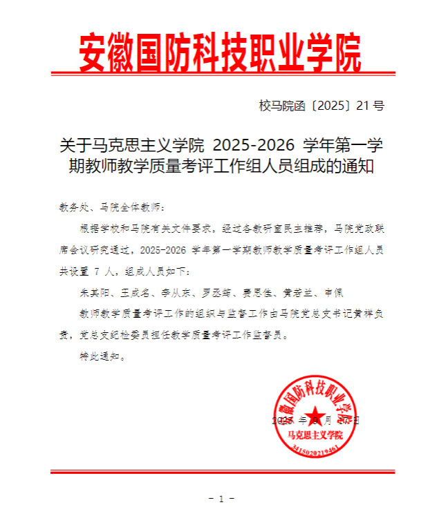 关于马克思主义学院2025-2026学年第一学期教师教学质量考评工作组人员组成的通知