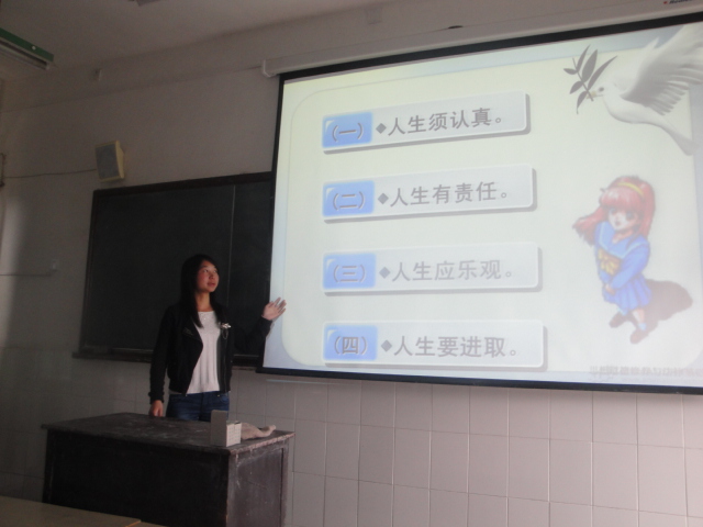 竞赛现场,五位老师先后以“建设中国特色社会主义文化” “领悟人生真谛 创造人生价值”“社会主义改革和对外开放”“坚持社会主义初级阶段的基本经济制度”“追求远大理想坚定崇高信念”为题进行了精彩的授课,他们渊博的学识,精妙的语言,引人入胜的授课技巧,做工精美的PPT课件,体现了他们良好的教学基本功。经评选,匡宁获得本次活动一等奖。