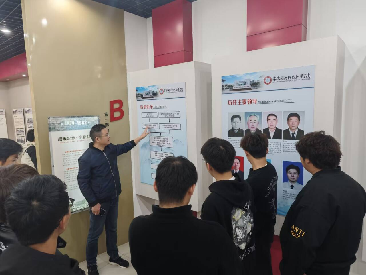 校史馆内,一幅幅珍贵的历史照片、一件件耀眼的奖杯奖项、一段段鲜活的历史记忆,仿佛穿越时空隧道,引导同学们感受着学校厚重的历史积淀、丰硕的办学成果和奋发的进取精神。经过思政课教师的讲解,同学们沉浸式体悟学校弦歌不辍的办学成就,近距离感受学校厚德、强能、励志、笃行的精神之志。