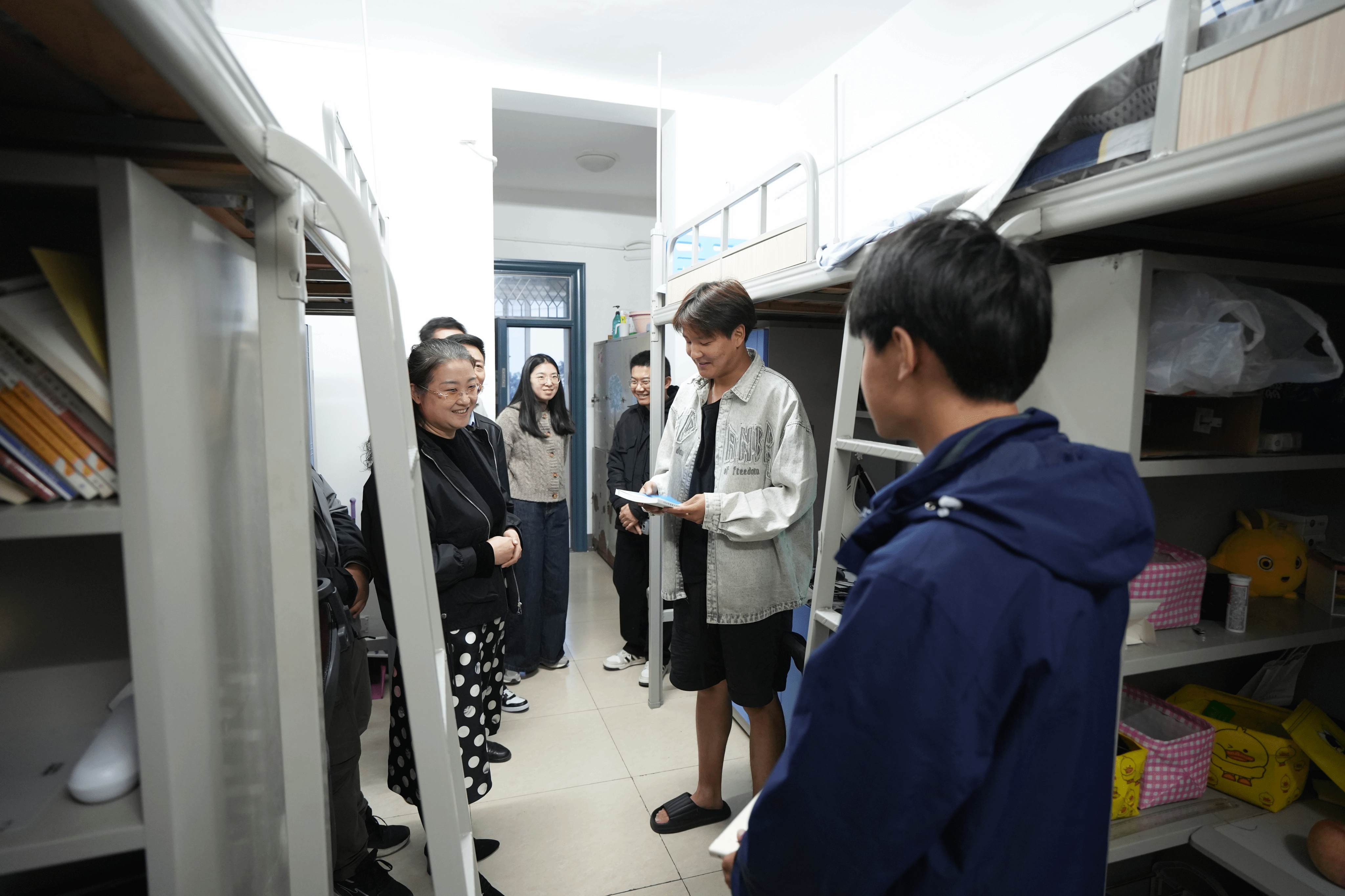 本网讯(马克思主义学院 武晓璐)为进一步加强师生联系,深入了解学生实际需求和困难。11月8日下午,马克思主义学院党总支与宣传部党支部联合行动,精心组织党员教师分成多个小组,深入学生宿舍开展了一场别开生面的宿舍走访活动。此次活动旨在以心交心,全方位关注学生的学习与生活状态,通过赠送经典书籍,为学生适应大学生活以及成长成才注入温暖动力。