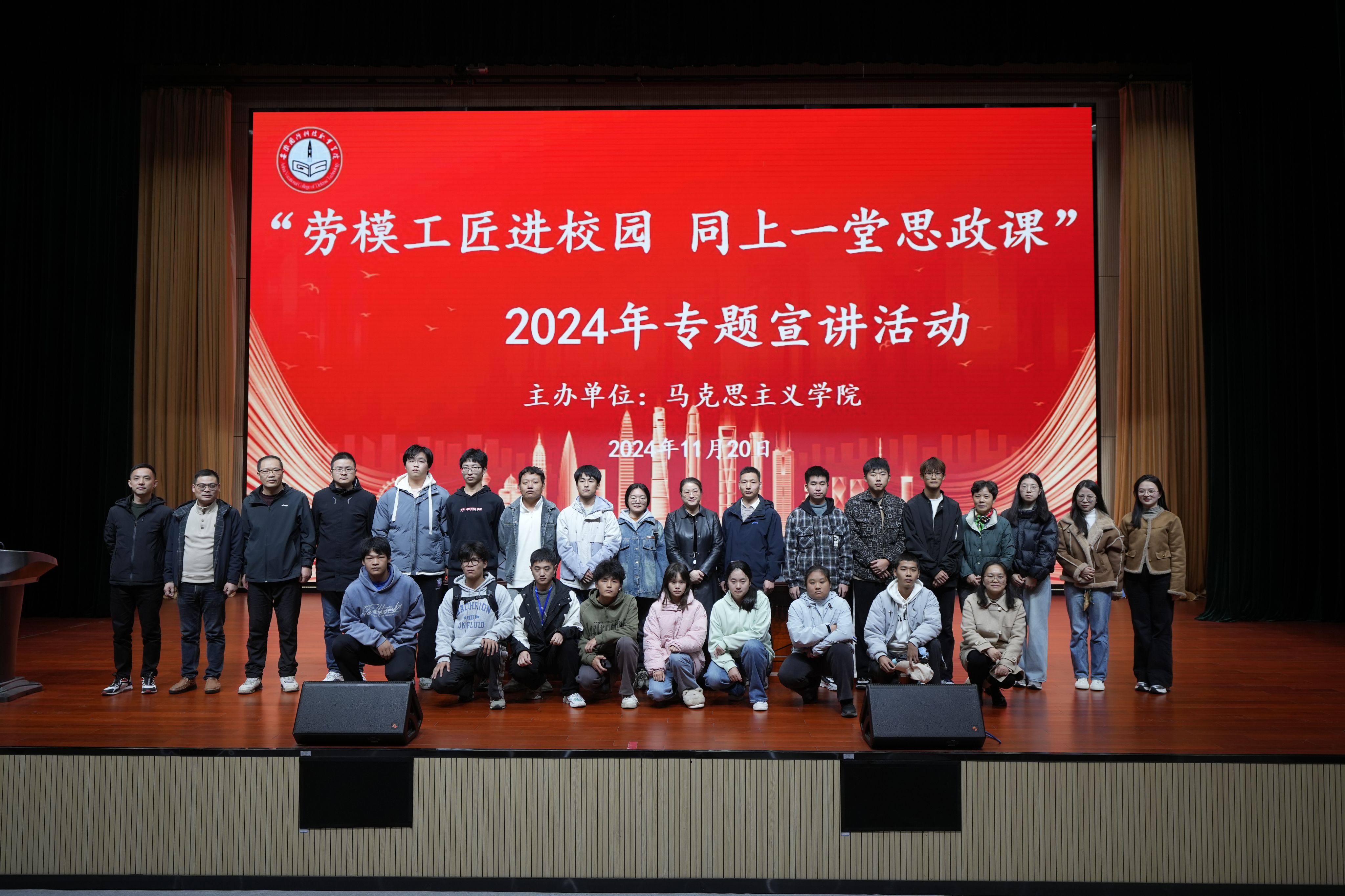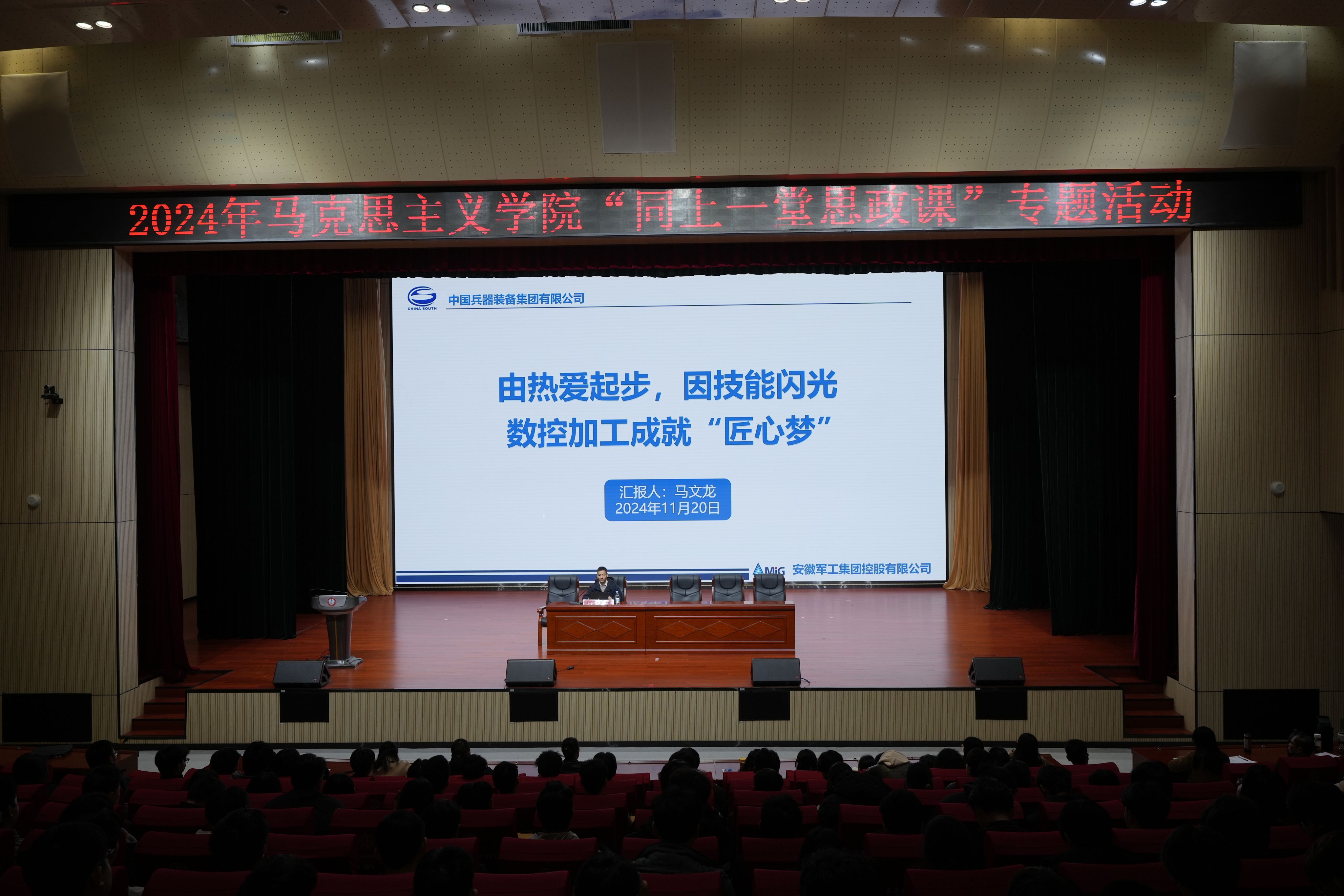 为深入学习贯彻党的二十届三中全会精神,把劳模精神、工匠精神、劳动精神融入课堂,激励beat365青年学生多学知识、苦练本领,走技能成才、技能报国之路。11月20日下午,由马克思主义学院主办的“劳模工匠进校园 同上一堂思政课”宣讲活动在产教融合中心多功能报告厅举行。本次宣讲活动邀请了安徽省技术能手、安徽省五一劳动奖章获得者马文龙高级技师主讲,校党委委员、宣传部部长、马克思主义学院院长陈思和全体思政课教师及2024级近500名学生代表参加了宣讲活动,活动由马克思主义学院副院长聂勇主持。