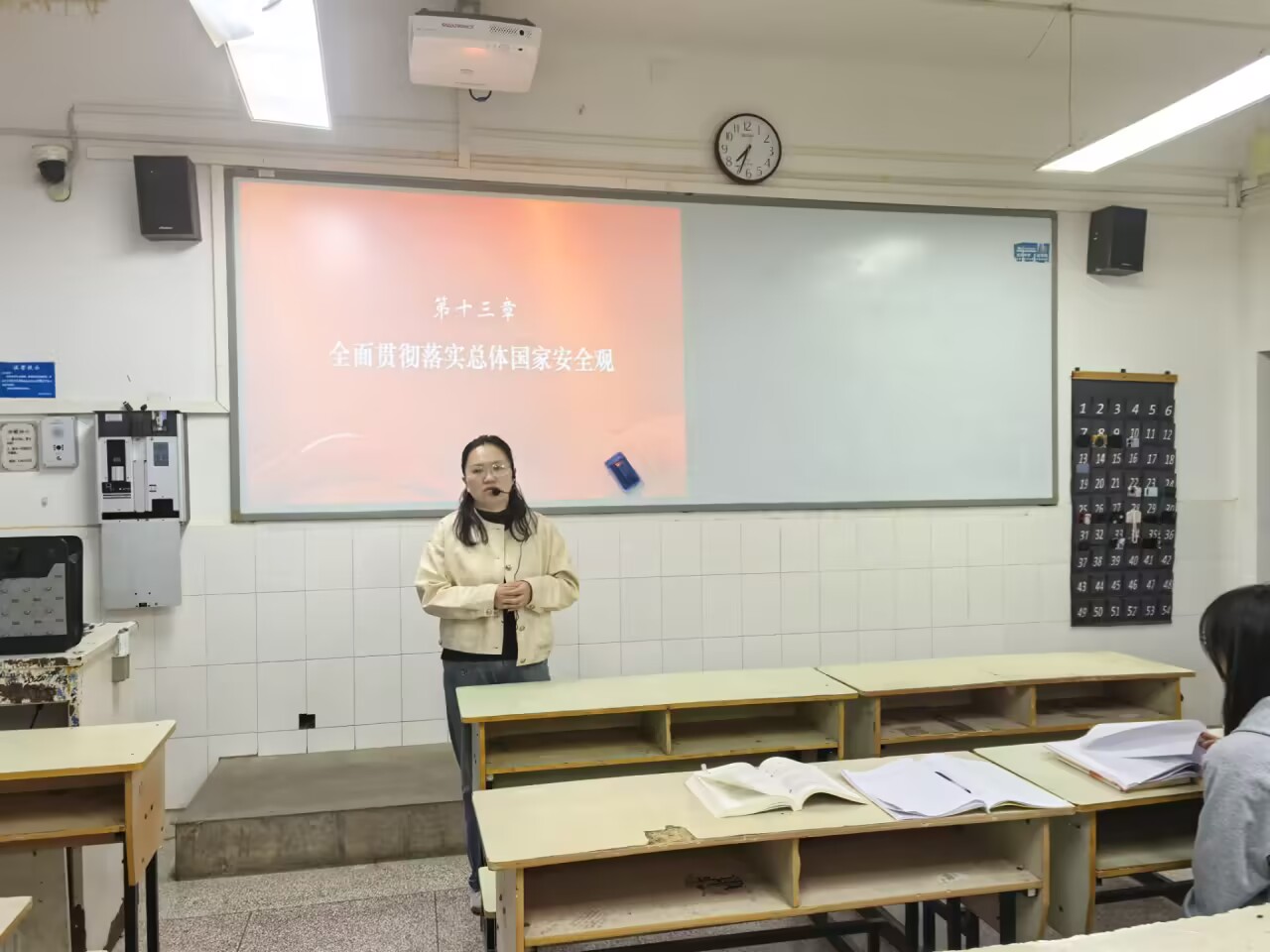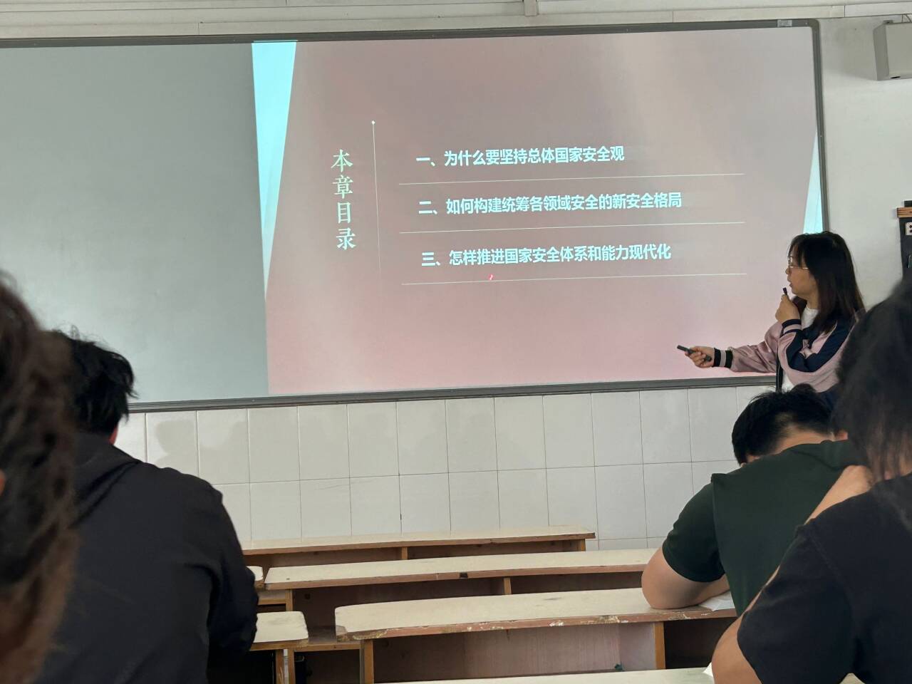汤晓莉老师正在为学生讲授有关《全面贯彻落实总体国家安全观》的内容