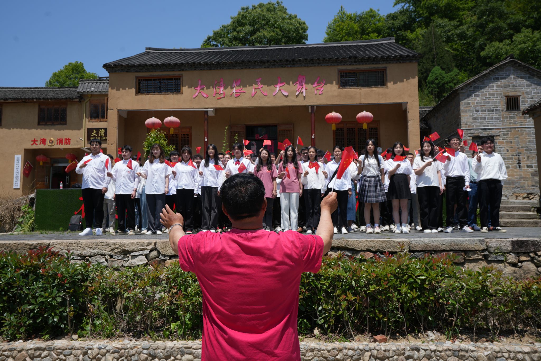 在大湾村的农氏大舞台,同学们唱响了《八月桂花遍地开》。这一曲诞生于金寨县的经典红歌,滚烫的旋律,激情饱满的歌声在红色革命方向的指引下、在耀眼的阳光下,唱进了同学们的心里,播下一颗颗红色的种子,推动革命文化教育“身到”“眼到”“口到”“心到”落地见实效。同学们嘹亮的歌声、欢快的节奏,将这首歌曲演绎得淋漓尽致,表达了对祖国的深情赞美、对幸福生活的向往和对光明未来的美好憧憬,充满青春和感染力。