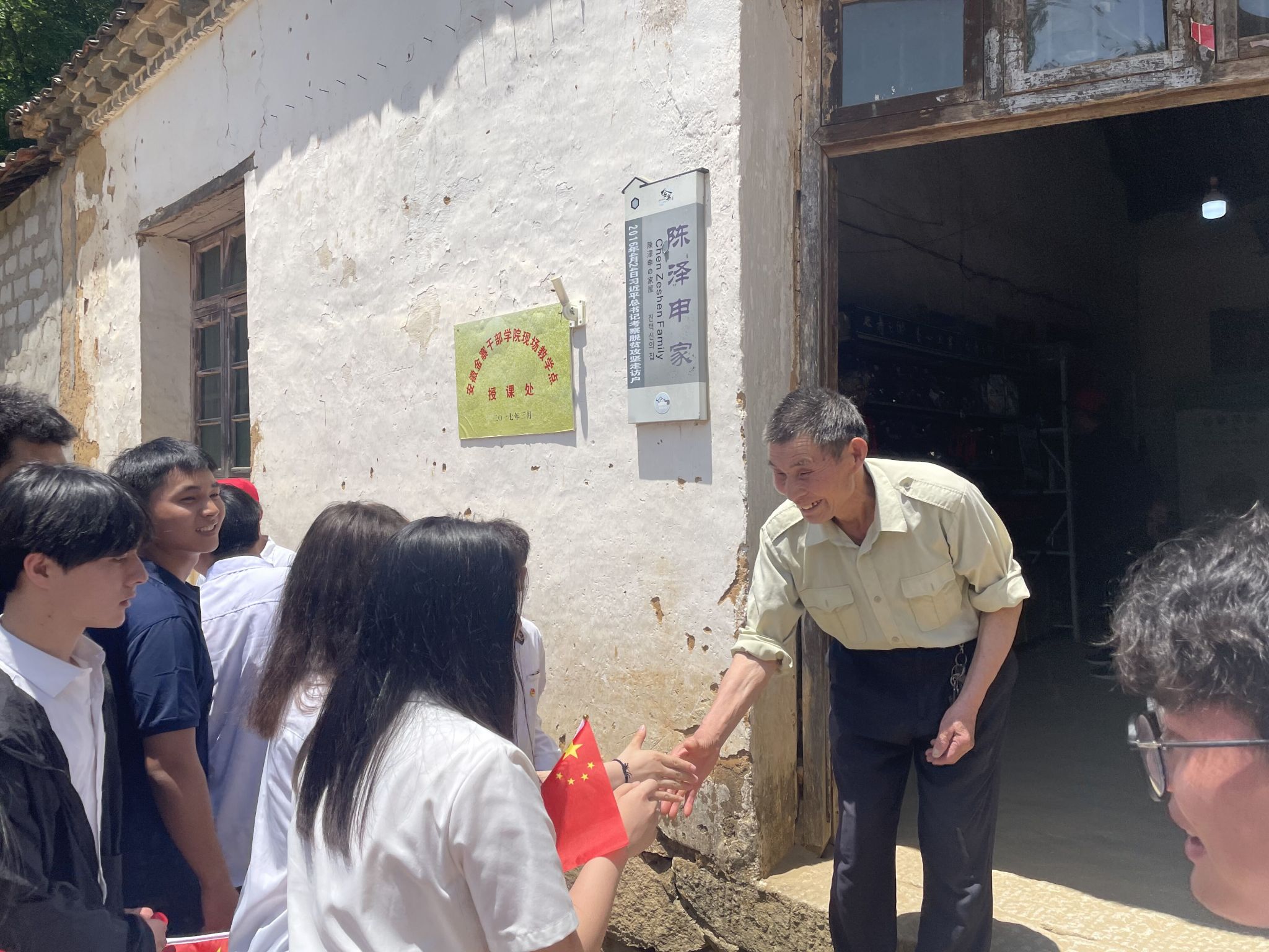活动的第二个环节,师生坐车前往位于大别山腹地的“全国脱贫攻坚楷模”花石乡大湾村。大家首先来到大湾村纪念馆,共同观看了习近平总书记2016年视察大湾村的纪录片,真切感受到了总书记对革命老区人民的牵挂。随后同学们还来到了陈泽申老人的家里,陈泽申向师生们介绍大湾村的变化,谈到了现在的美好生活,感叹道,习近平总书记对老百姓的亲切关心和党的好政策。最后,师生们与陈泽申合影留念。在与陈泽申的交谈中同学们感悟到青年一代应当大力弘扬脱贫攻坚精神,坚定信心、勇毅前行,团结拼搏、顽强奋斗。