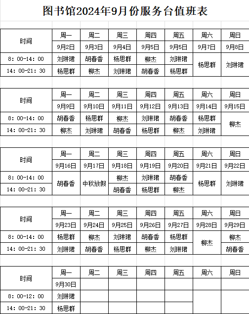 图书馆2024年9月份服务台值班表