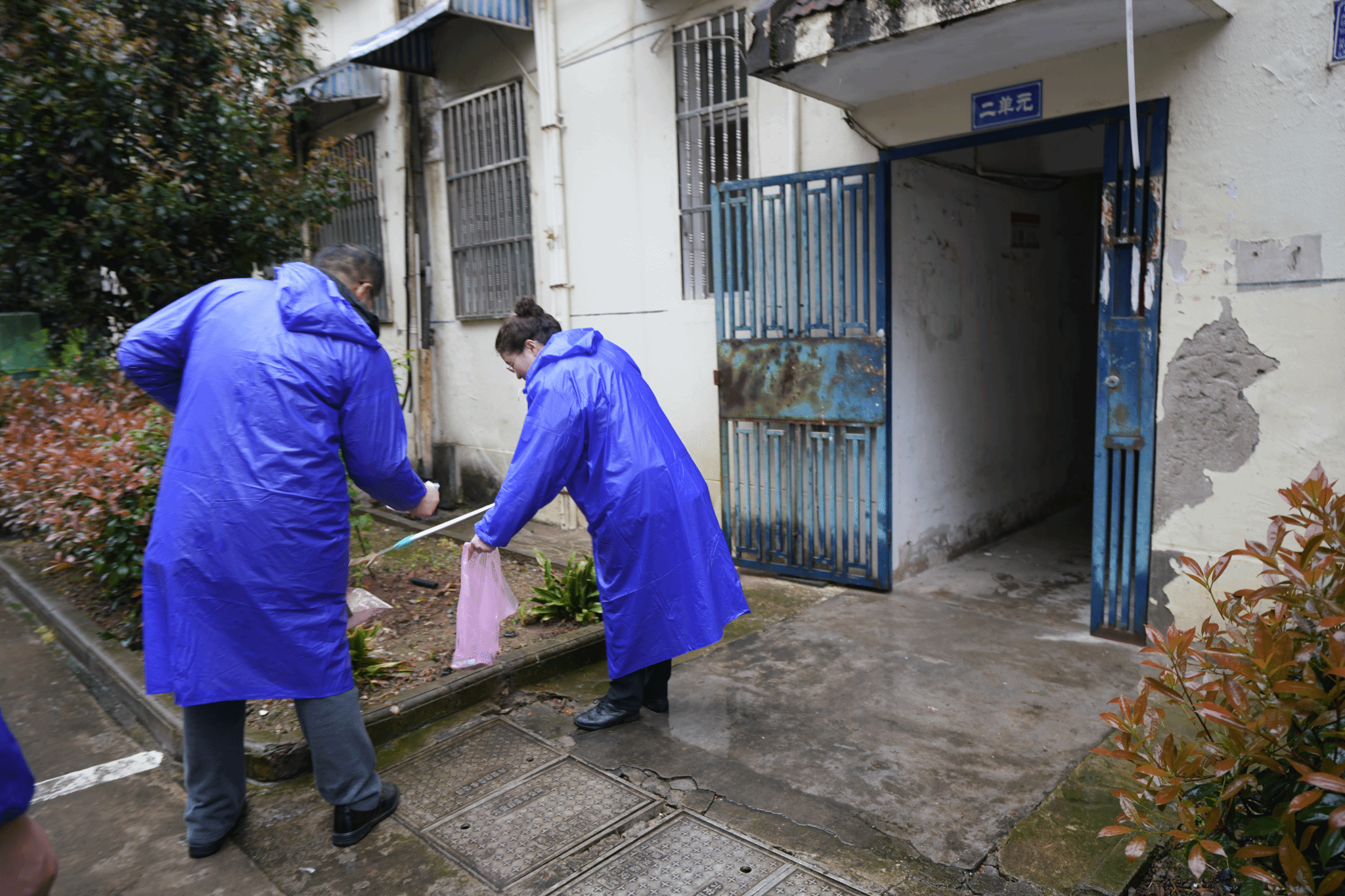 随后,全体成员携带夹烟钳、垃圾袋等卫生清理工具来到江南社区大别山新村志愿活动现场。虽然冒着蒙蒙细雨,但师生们丝毫不减热情,分组迅速投入到对该小区的环境卫生清理工作中。在社区干部的指引下,大家分别前往小区楼道等公共区域清扫垃圾杂物、清除小广告等,协助改善小区环境卫生,并在小区拉设文明城市宣传横幅,宣传引导小区居民自觉主动维护环境文明卫生,得到社区干部和小区居民的一致认可与好评。