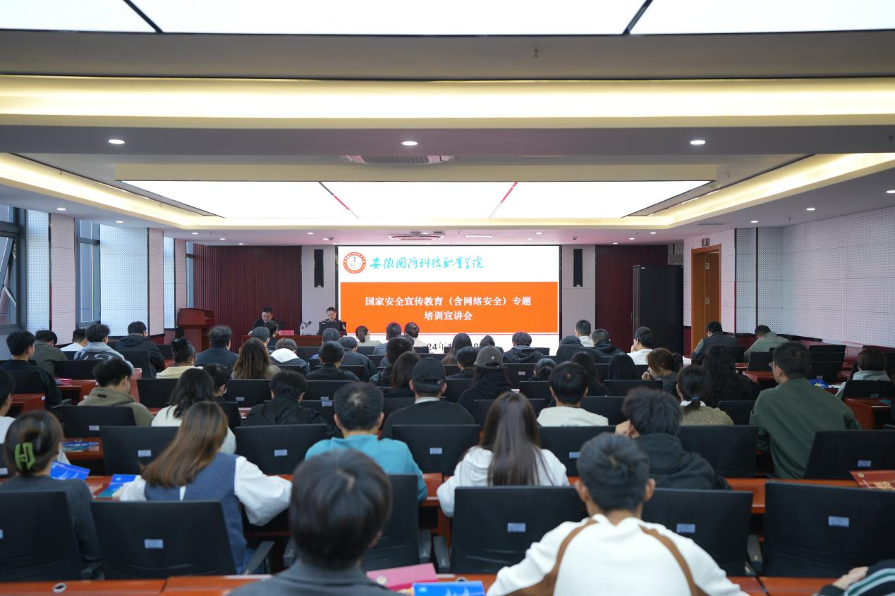 本网讯(宣传部 李浩)为深入贯彻落实党的二十届三中全会精神,全面贯彻总体国家安全观,进一步强化广大师生的国家安全意识和素养,10月30日下午,beat365唯一官方网站在产教融合中心第二报告厅举办国家安全教育(含网络安全)专题培训宣讲活动。此次活动由党委宣传部主办,邀请了六安市国家安全局吴婧警官进行专题宣讲。校党委委员、宣传部部部长陈思和全体信息员、社团指导教师以及学生干部代表80余人参加宣讲会,会议由宣传部副部长朱其阳主持。