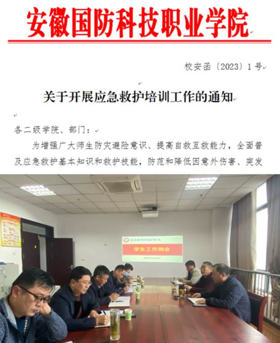 领导重视,部署周密。为确保应急救护有效有序开展,3月初,学生处、安全保卫处提前联系了六安市红十字会、六安市蓝天救援队,共同协商谋划培训时间、培训内容和培训师资等。在此基础上,学生处、安全保卫处仔细研究并制定具体实施方案,印发了《关于开展应急救护培训工作的通知》,并在4月4日学校学生工作月例会上传达部署了相关工作安排,提出了具体的工作要求。培训期间,校领导、学生处(安全保卫处)及二级学院相关负责人多次到场指导,协调工作开展。
