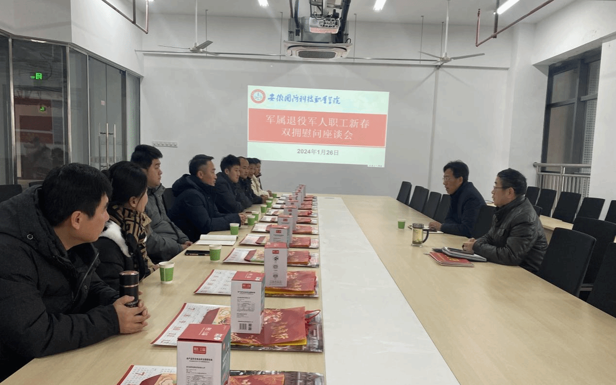 本网讯(学生处 孙洋洋)为深入学习贯彻党的二十大精神和习近平总书记关于双拥工作的重要指示精神,大力弘扬拥军优属、拥政爱民光荣传统,营造浓厚双拥氛围,1月25日上午,学校在产教融合中心三楼会议室召开2024年春节双拥慰问座谈会。校党委委员、副校长袁旗,人武部部长孙武、现役军属、退役军人教职工参加座谈会。