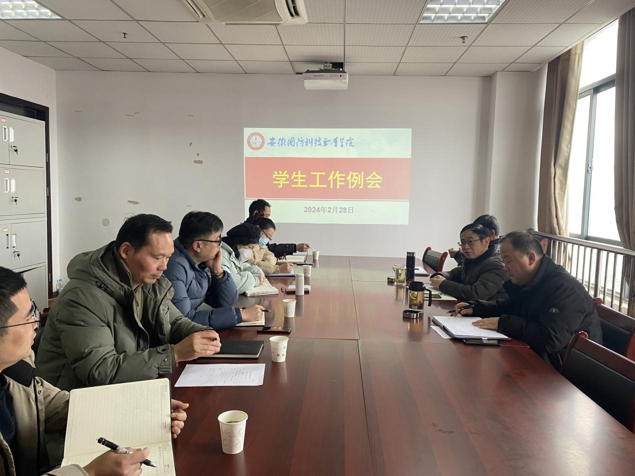 本网讯 (学生处 孙洋洋)2月28日下午,学生处在秉心楼1012会议室召开期初学生工作会议。学生处、安全保卫处处长孙武、学生处副处长张志鸿、安全保卫处副处长孙策、各二级学院书记、副书记参加会议。会议由孙武主持。