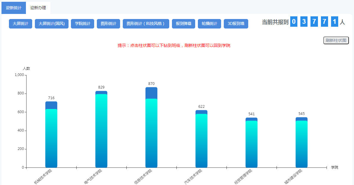 智慧迎新、高效便捷。为提升报到效率,掌握精准数据,学校利用迎新系统等现代信息技术手段助力新生入学。通过迎新系统扫码报到,迎新人员可实时掌握新生报到“大数据”,随时了解报到率、生源地等各种信息,整体把握学校迎新进度。利用大数据服务平台迎新,减少了迎新现场工作量,让迎新工作更加高效地、有序地推进,为校园管理提供了准确的数据分析和预判。