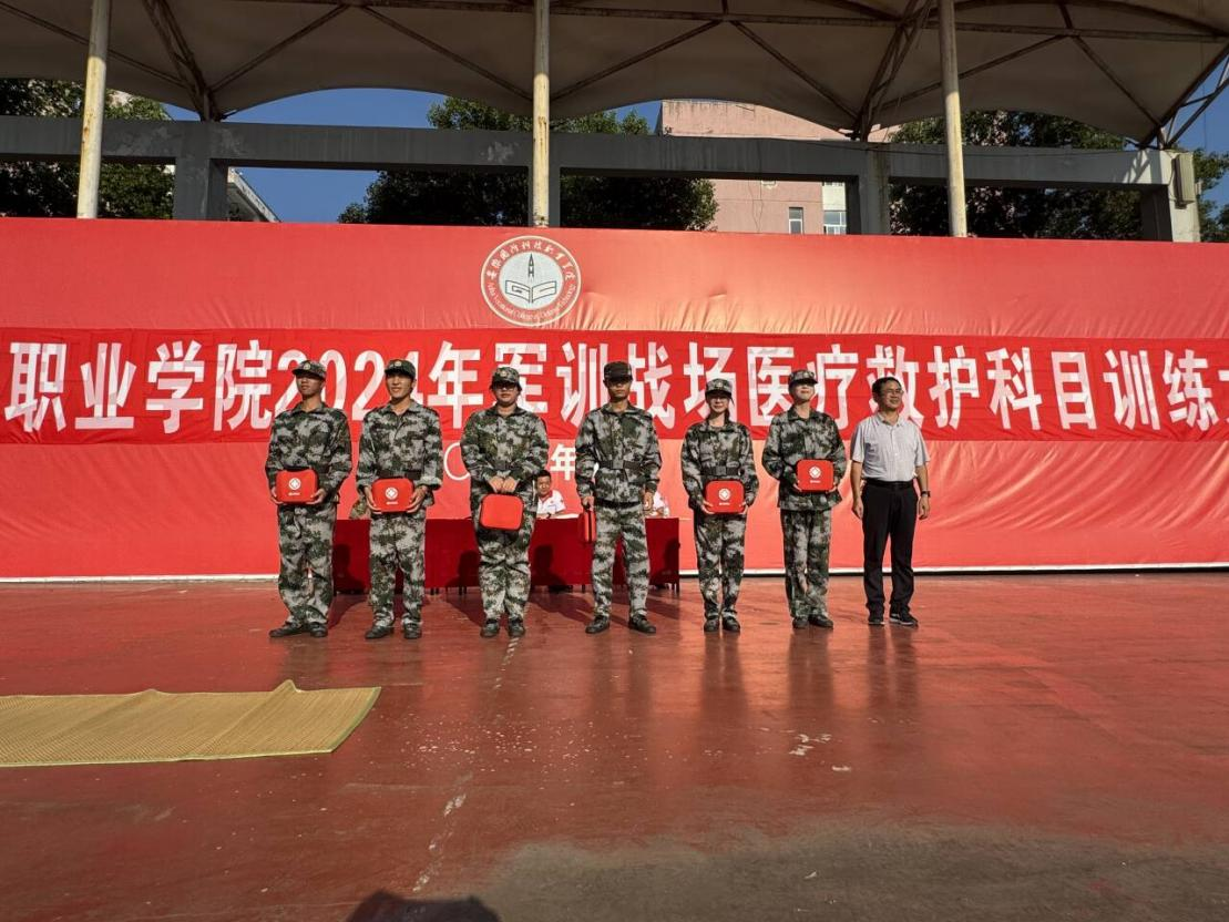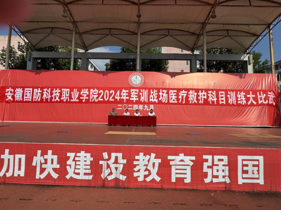 本网讯(人武部 光子木)为深入学习贯彻党的二十届三中全会精神和习近平总书记关于安全的重要论述,牢固树立“人民至上、生命至上”理念,积极开展“救在身边、护好校园”行动。9月24日下午,学校在运动场开展2024年军训战场医疗救护科目训练大比武,校学生处(人武部)处(部)长孙武、六安市红十字救援队队长胡宏、金安区人武部总教官卫功正担任评委、全体2024级新生现场观摩此次比武。