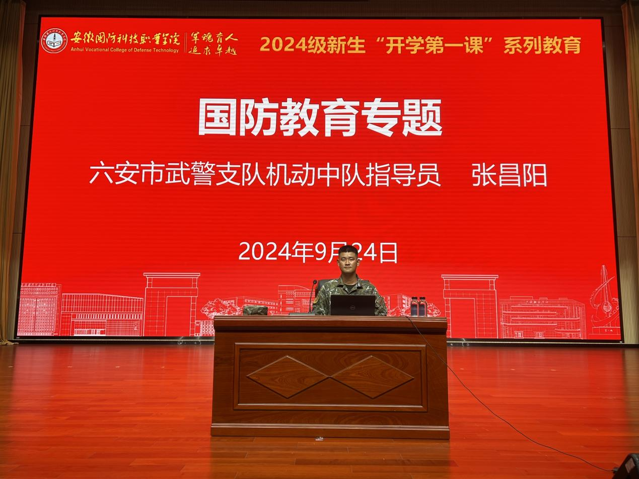 9月24日晚,六安市武警支队机动中队指导员张昌阳为新生作了题为“认清安全形势,强化国防观念,争做一名不负韶华的新时代有志青年”的国防教育专题讲座。张昌阳指出,历史是最好的教科书,也是最好的清醒剂。他详细阐述了我国各个时期的国防建设以及我国当前的安全形势,深刻揭示了国防的重要性和国防教育的重大意义,勉励同学们要时刻保持家国情怀、树立投身国防的信念,对党和人民军队充满信心,努力学习为国家建设作出贡献。
