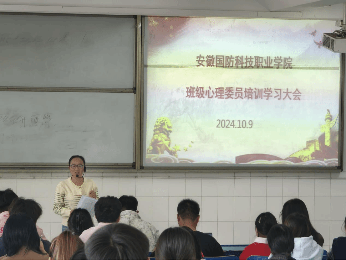 本网讯(学生处 费思佳)为了进一步完善和规范班级心理委员队伍,确保2024年大学生心理健康测评工作的顺利进行,心理健康教育中心于10月9日下午,在二教205教室召开了2024年秋学期新生班级心理委员培训学习大会。本次培训由心理健康教育中心主任戴柳主持,心理咨询员费思佳和各2024年应测班级的心理委员参加。