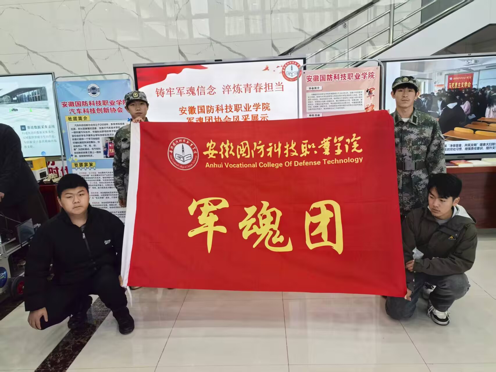 展桌上陈列的有叠放整齐的军装;模拟枪、坦克及飞机模型;《军队条例条令学》、军魂团2025-2026学年训练计划表等,显示屏上循环播放着协会简介、开展的思想政治引领、大学生征兵与国防动员、志愿服务、素质能力提升等特色品牌活动及社团的工作成效。一张张照片串联起社团“以军魂砺作风、以国防铸底色”的鲜明特色,从特色活动中的作风锤炼,到志愿场景里的青春奉献,军魂团以“实物+影像”的具象表达,书写着新时代青年以担当践行使命、以热忱守护信仰的青春答卷。
