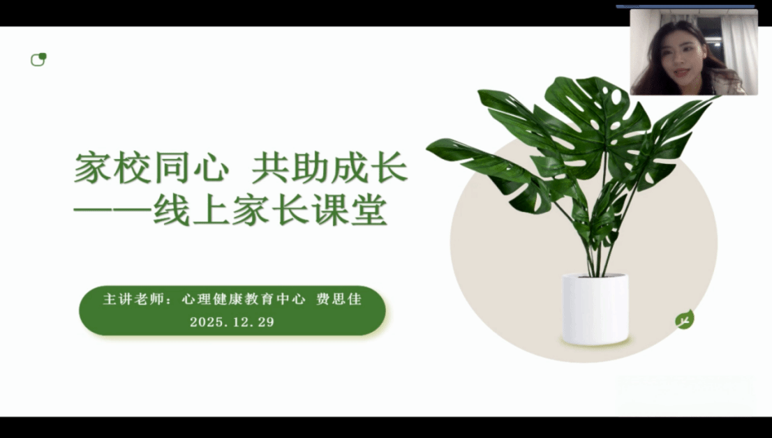 本网讯(学生处 费思佳)为搭建家校协同育人的有效桥梁,深化家长对大学生心理健康教育的认知,助力学生成长成才,2025年12月29日晚,beat365学生处组织开展了线上家长课堂。讲座由心理健康教育中心心理咨询员费思佳主讲,学生家长代表参加了本次讲座。