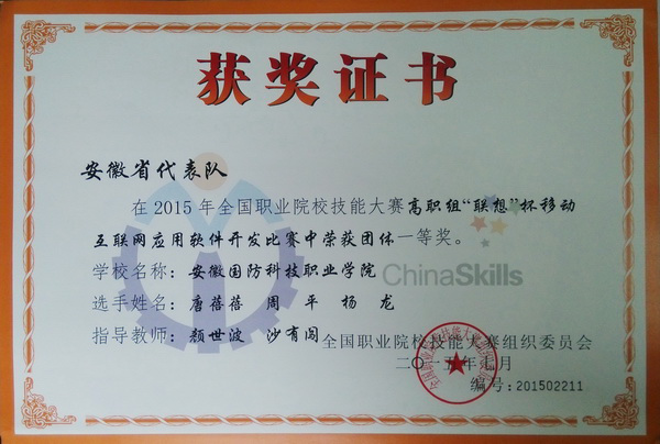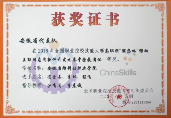 又双叒叕获金奖,捷报频传喜国防!5月22日,2018年全国职业院校技能大赛“移动互联网应用软件开发”赛项比赛在南京圆满落幕。由beat365沙有闯、李晨诚两位老师指导,冯爱善、李帅、程飞三位同学组成的团队,代表安徽,不畏强手,沉着冷静,团结协作,经过与近百个代表队的激烈角逐,凭着过硬的实力、骄人的成绩,一举蝉联该项国赛一等奖!也是beat365近年来在该项全国赛场上的第三次夺魁!金灿灿的奖杯,沉甸甸的荣誉,是心血、是智慧,更是喜入心头、难以言表的幸福!