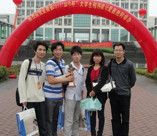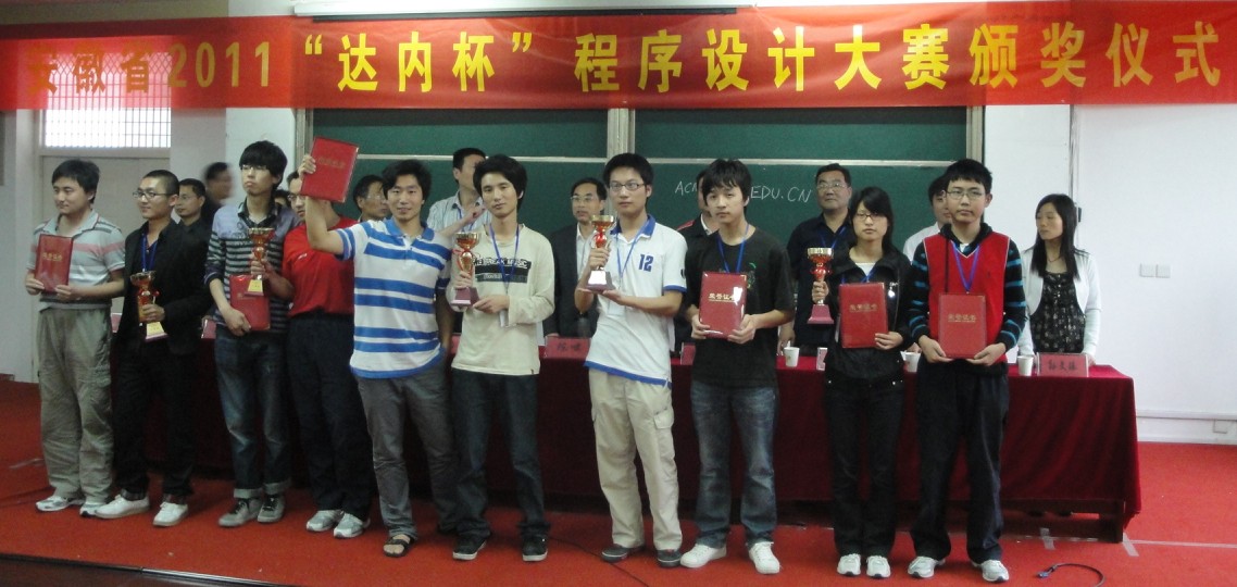 由安徽省高等学校计算机教育研究会主办,合肥学院承办的安徽省2011年“达内杯”大学生程序设计竞赛于2011年5月22日在合肥学院举行,我系09软件技术专业的仰泽星、陶军、成向阳组成的ahgf010队在历时五个小时的激烈竞争中,荣获高职组第一名的好成绩。