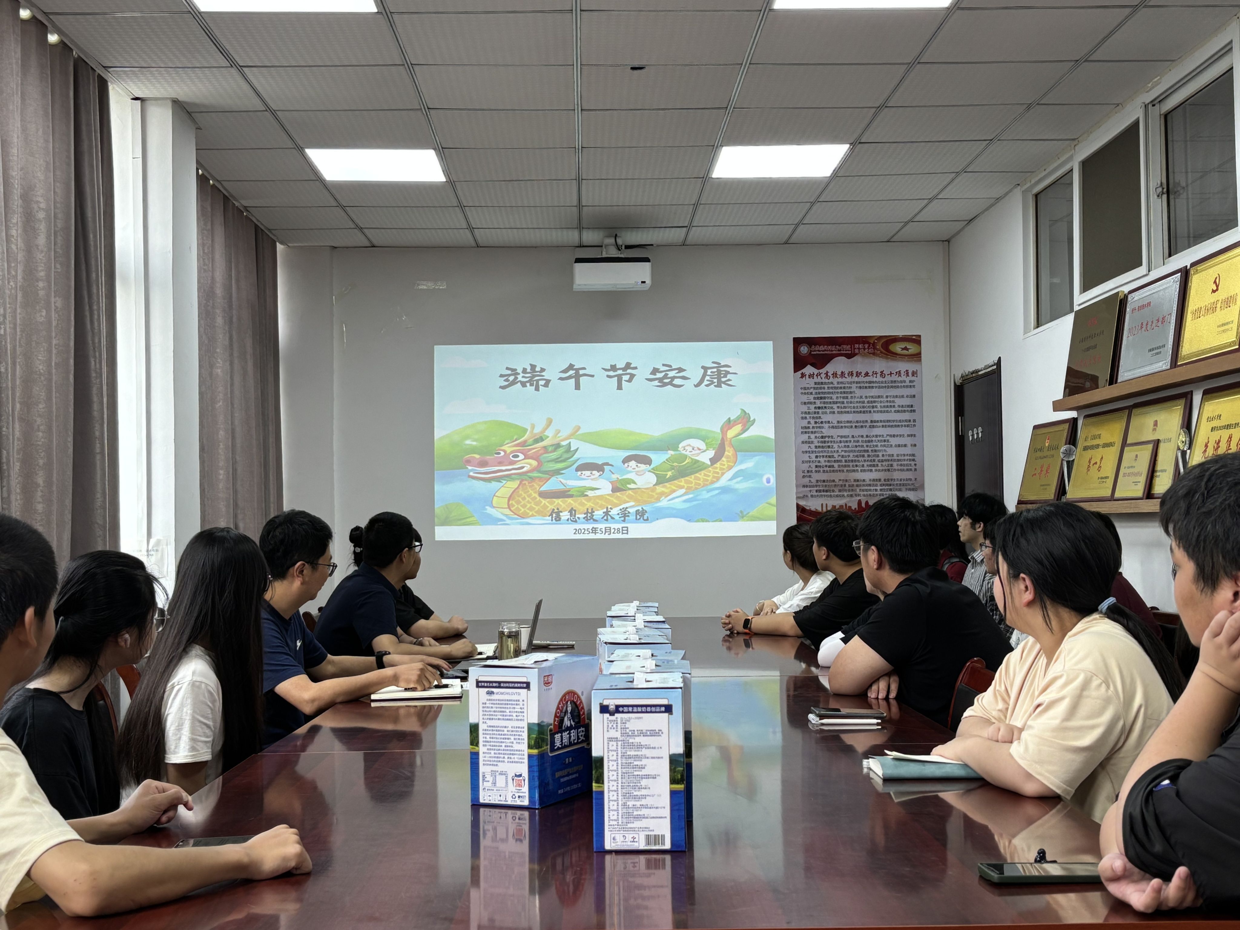 端午情牵,暖助学子。5月28日下午,开展“我与书记共庆佳节”贫困家庭学生慰问活动。信息技术学院领导与家庭困难学生代表座谈交流并送上“端午暖心礼包”,同学们分享学习生活中的困惑,书记认真倾听并给予鼓励和建议,鼓励同学们勇敢面对困难,将困境化作成长动力,并表示学校会持续优化帮扶政策。此外,针对校外实习的特殊困难学生,开展“云端共庆佳节”活动,辅导员书写慰问祝福语,学院统一邮寄节日慰问品,让学子们在他乡也能感受学校关怀与节日温暖。